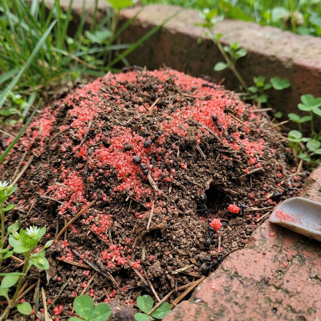 4️⃣ OPÓŹNIONE DZIAŁANIE – substancja biobójcza (cypermetryna) zaczyna działać dopiero po kilku lub kilkunastu godzinach. Jest to celowe – gdyby mrówka ginęła od razu po dotknięciu granulki, reszta kolonii szybko uznałaby to miejsce za niebezpieczne i przestała zbierać trutkę.