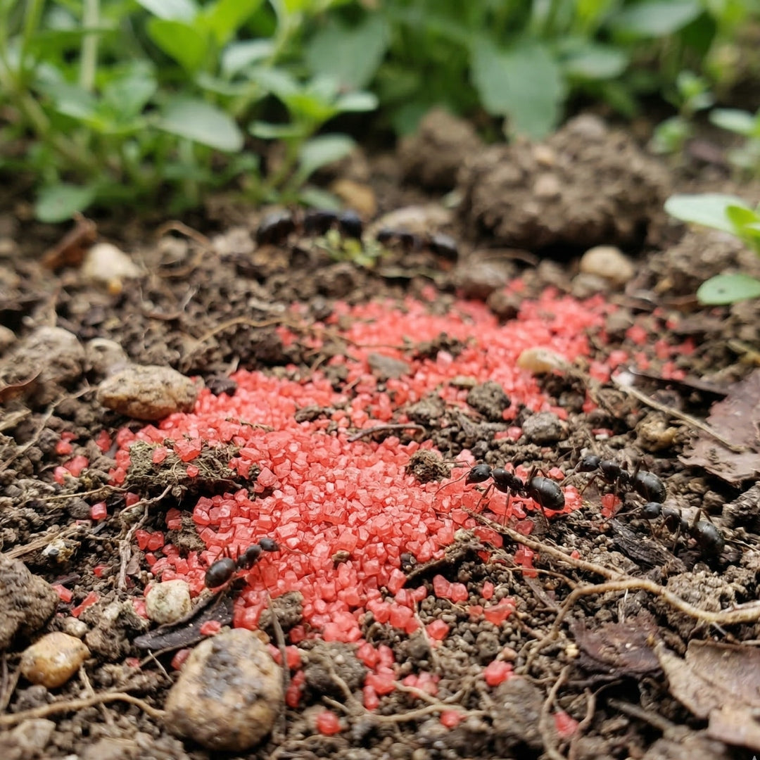 4️⃣ OPÓŹNIONE DZIAŁANIE – substancja biobójcza (cypermetryna) zaczyna działać dopiero po kilku lub kilkunastu godzinach. Jest to celowe – gdyby mrówka ginęła od razu po dotknięciu granulki, reszta kolonii szybko uznałaby to miejsce za niebezpieczne i przestała zbierać trutkę.